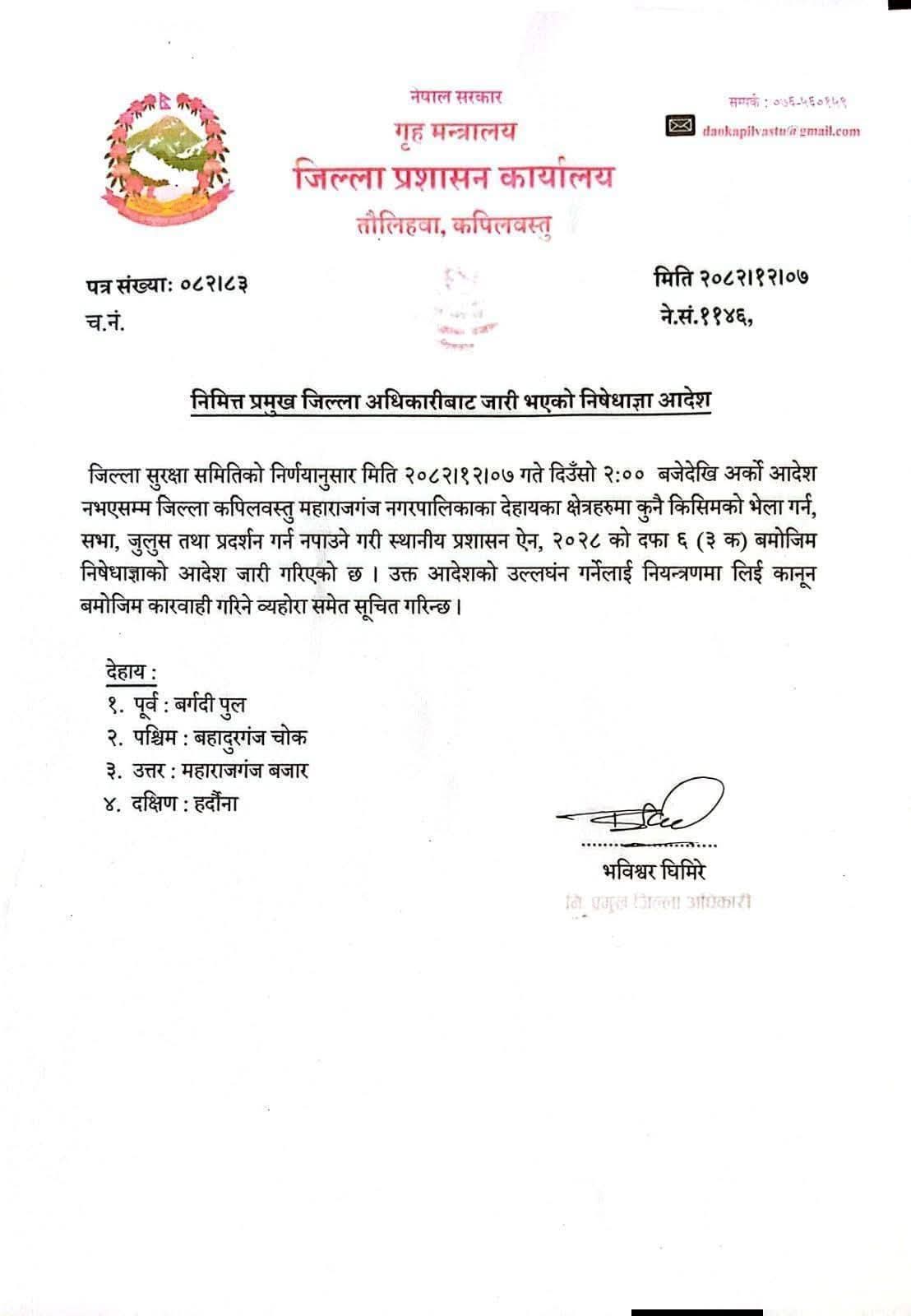 कपिलवस्तुकाे महाराजगन्जमा निषेधाज्ञा